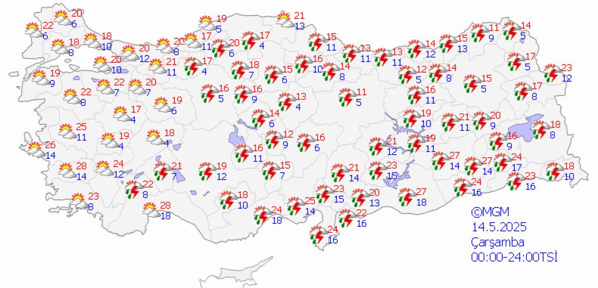 Son olarak 14 Mayıs Çarşamba günü, doğu bölgelerdeki yağışlar hafifleyecek, batı ve iç kısımlarda güneşli hava devam edecek, sıcaklıklar ise 5-27 derece ortasında değişecek.